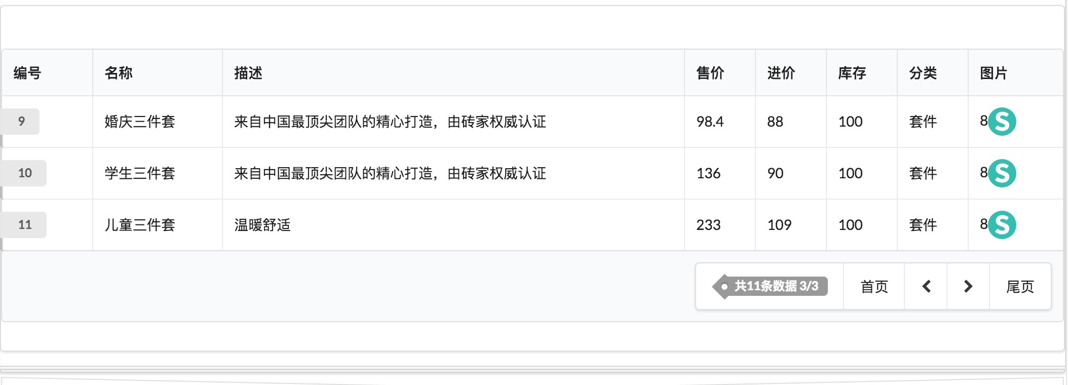 1234567891011121314151617181920212223242526272829303132333435363738<div id="ccc" class="ui blurring segment one column row"><!-- 在segment中出现遮罩层 --><div class="ui dimmer"><div class="ui text loader">加载中</div></div><table id="zzc" class="ui celled table"><thead><tr><th>编号</th><th>名称</th><th>描述</th><th>售价</th><th>进价</th><th>库存</th><th>分类</th><th>图片</th></tr></thead><tbody id="tbody"><!-- 数据列表 --></tbody><tfoot id="tfoot"><!-- 分页条 --></tfoot></table></div>